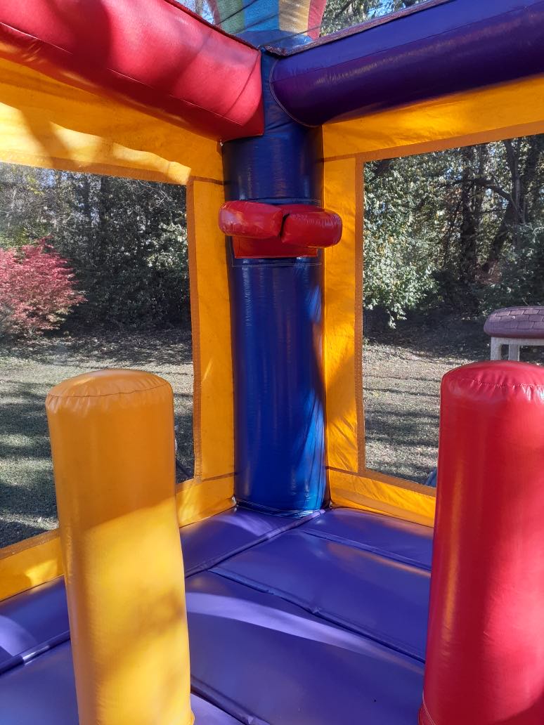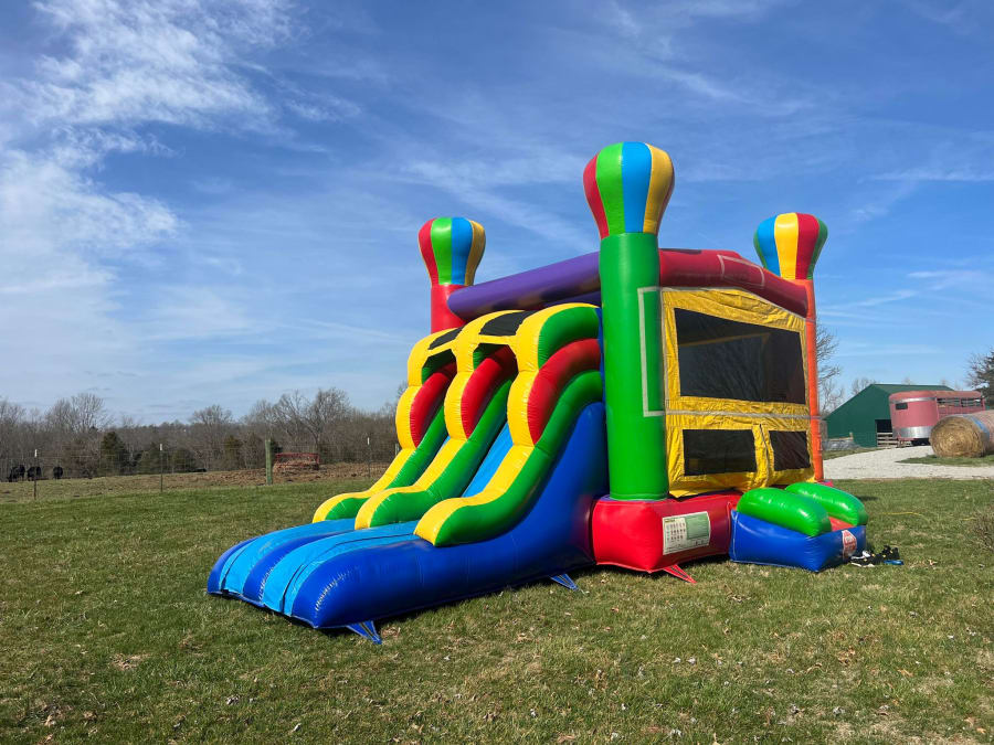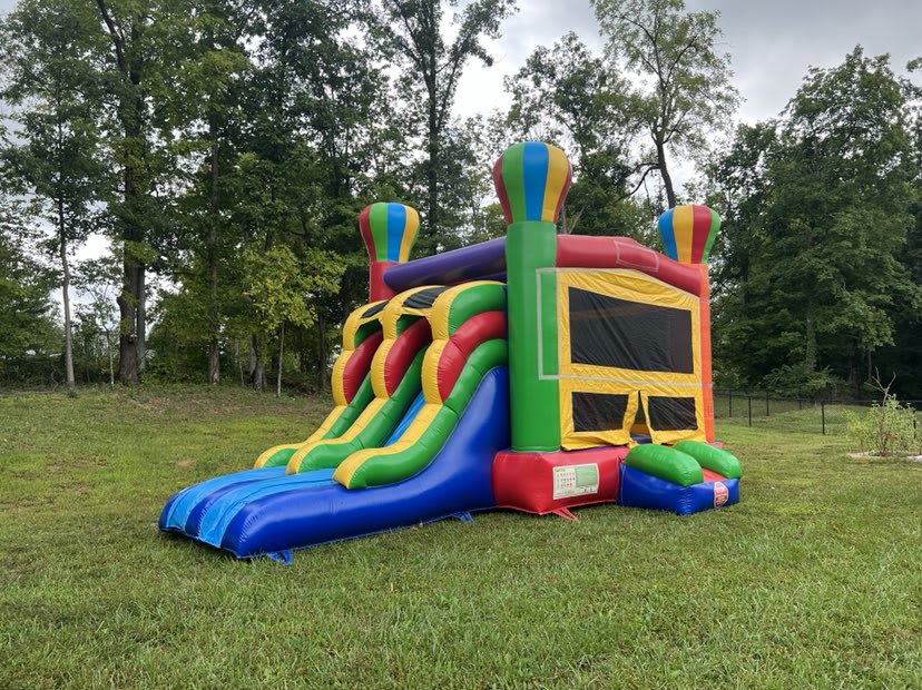 Our most popular / most rented Balloon Bounce House Combo ! This unit features 2 pop ups , 13x13 bouncing area , a basketball hoop & a dual lane slide . Being multi color & gender neutral , this Balloon Bounce House Combo is a huge wow factor at any party , event , or festival !